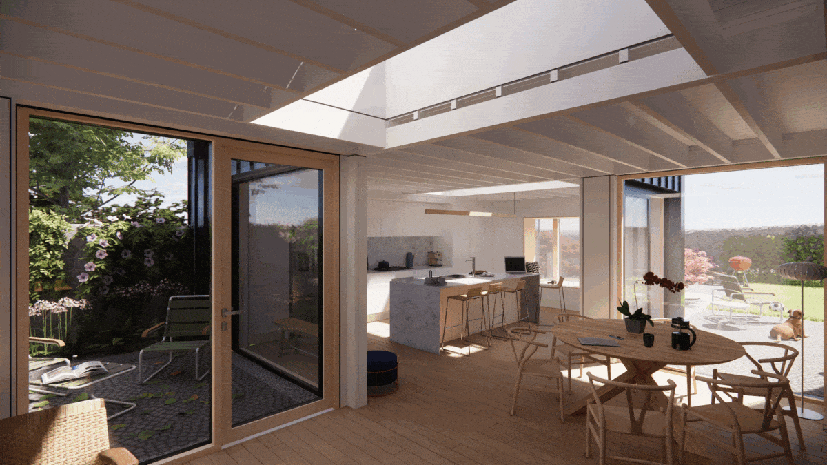 Technical study at Building Warrant stage, investigating the integration of structure with existing stone walls, timber roof beams, roof light, sun path and boundary condition